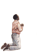 pavimento, senza appoggio, la corona del Rosari fra le mani, lo sguardo fisso